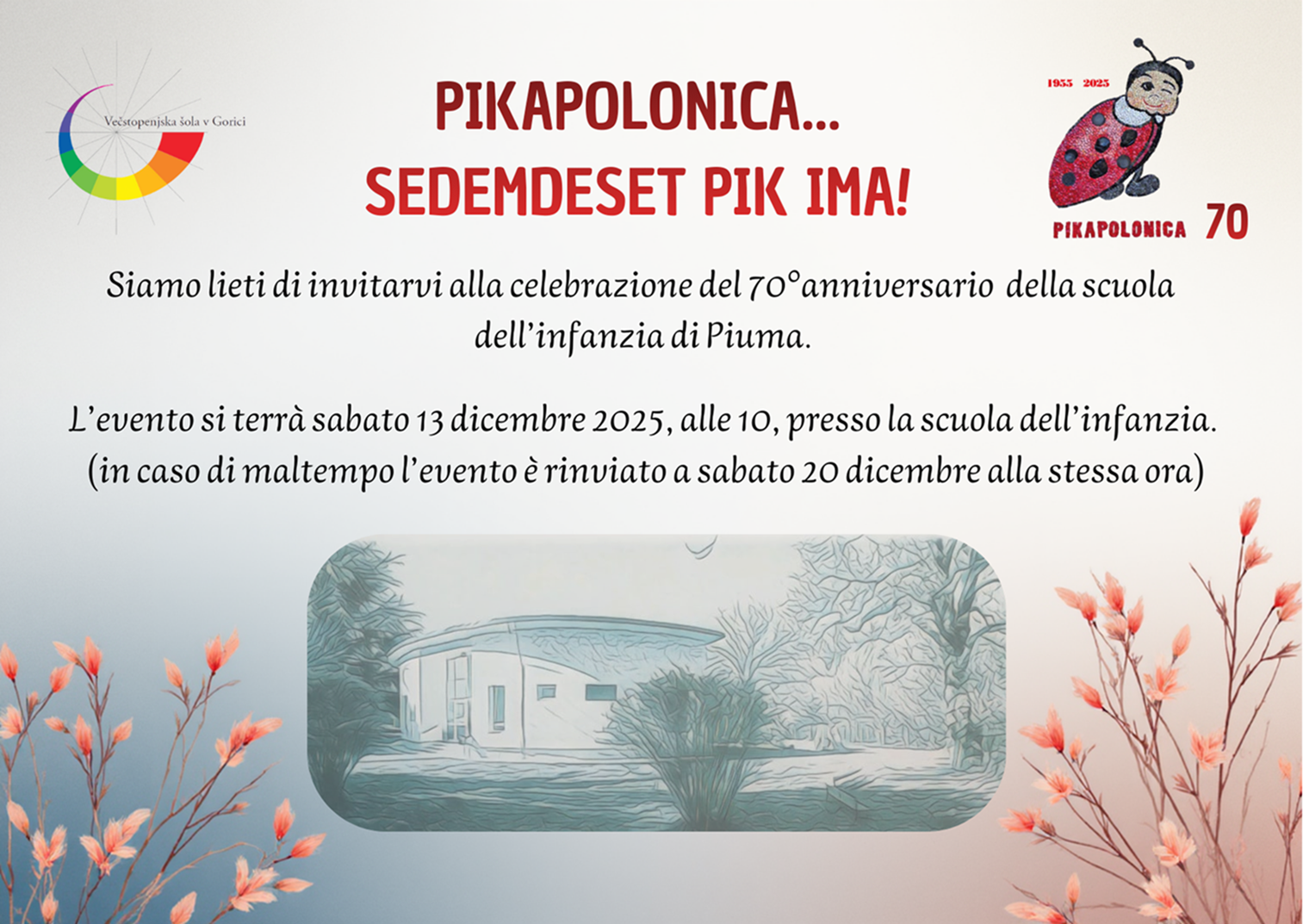 Siete cordialmente invitati alla cerimonia per il 70º anniversario della scuola dell’infanzia a Piuma, un’occasione speciale per festeggiare insieme questo importante traguardo.
